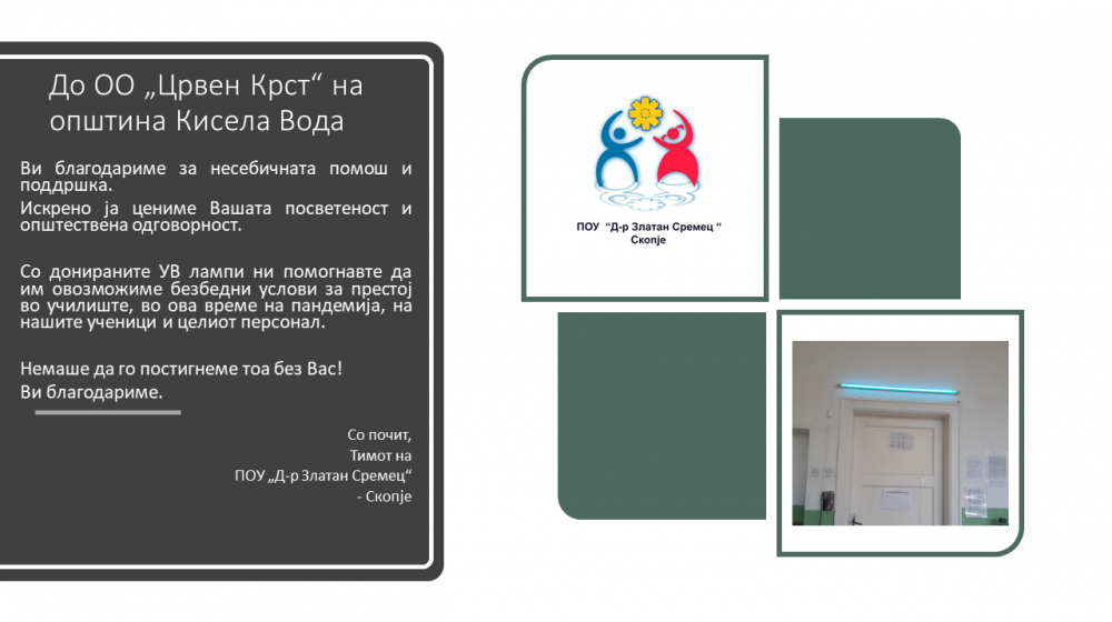 За безбедно да ги минуваат училишните денови, Општинска Организација Кисела Вода на училиштето му обезбеди 3 (три) УВ неонки за прочистување на воздухот во просториите кадешто учениците го поминуваат најголемиот дел од времето. Без разлика на посебноста и различноста на овие деца кои заслужуваат посебна нега, тие го имаат правото на идентични услови како останатите деца за цел подобро разивање и прилагодување на животните стандарди.
